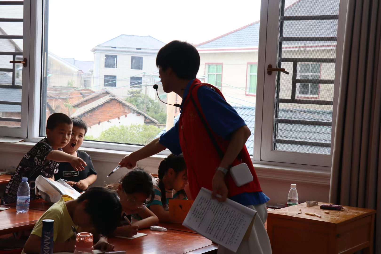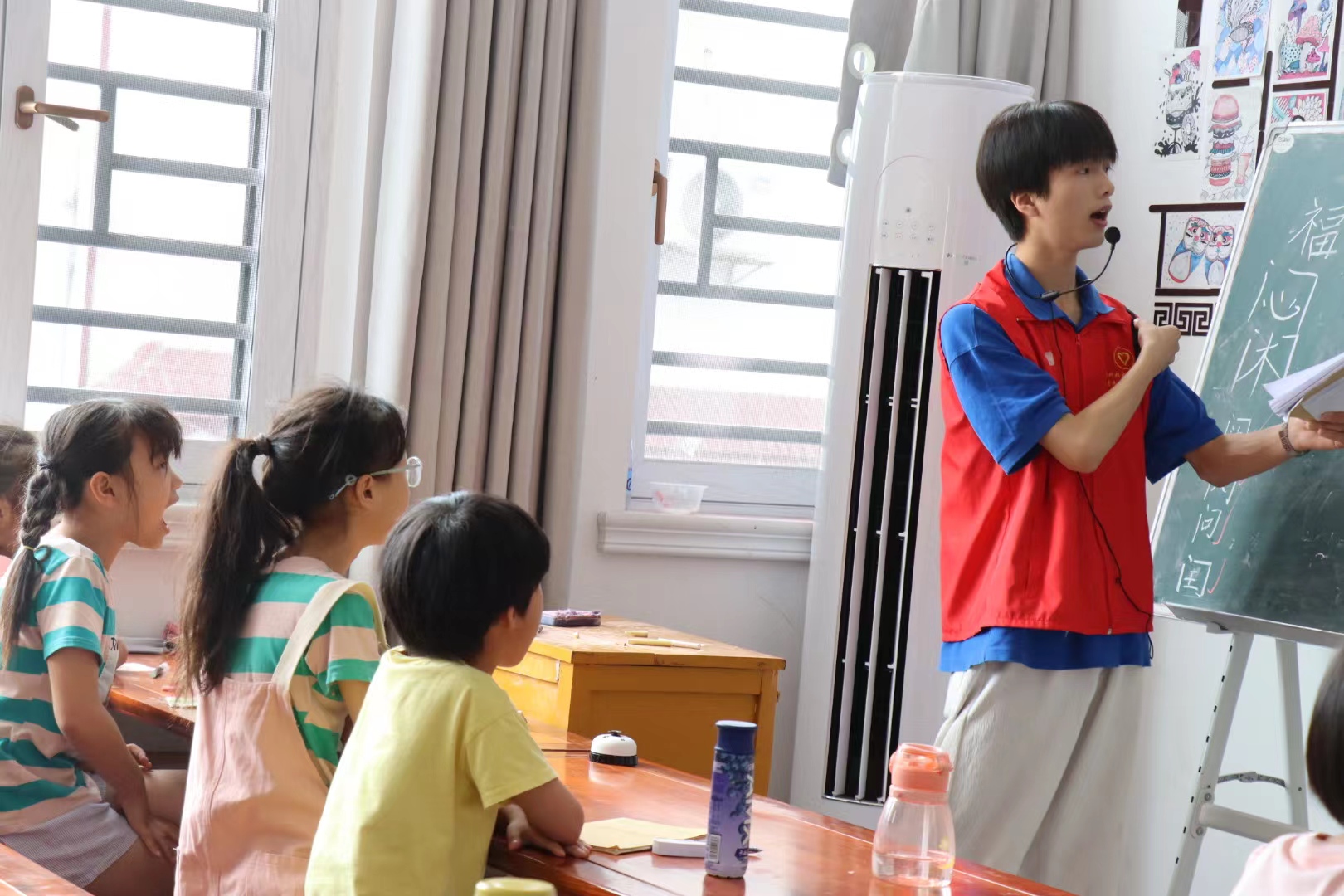 ▲志愿者与学生互动