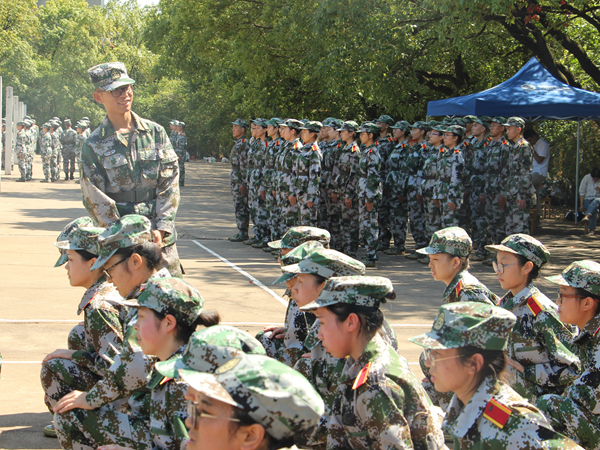 上午八点,我院2018级新生八个排的“新兵”个个身穿迷彩军装,在北校田径场集合,参加2018级新生军训动员大会,印有“乐动在线”的大旗飘扬在我院新生队列的最前方。动员大会上,我院新生认真听取学习了副校长的报告、教官代表的发言,欣赏了教官们带来的精彩表演。会后,全体新生由各排教官带领,前往位于训练场地—北校旧篮球场,开始正式训练。“拇指尖贴于食指第二关节,中指贴于裤缝……”教官从最基础的军姿动作要领开始亲自示范,在一声声刚劲有力口号下,新生们一丝不苟的完成立正、稍息、跨立、坐下、起立等训练任务。
