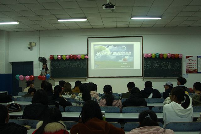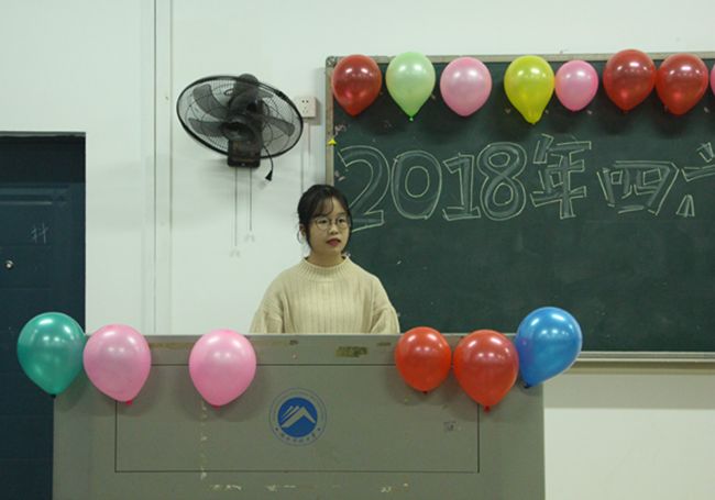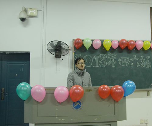 教室门口张贴着精美的海报,教室内的黑板上挂着七彩的气球,黑板上则是漂亮的艺术字体,在精心布置的第八教学楼1-3教室里,我院于11月9日下午四点迎来了一年一度的英语四六级经验交流会。为助力即将到来的英语四六级考试,解答同学们的疑难困惑。我院辅导员赵晗冰老师、17级四级成绩优秀学生代表及17、18部分学生参加了本次经验交流会。