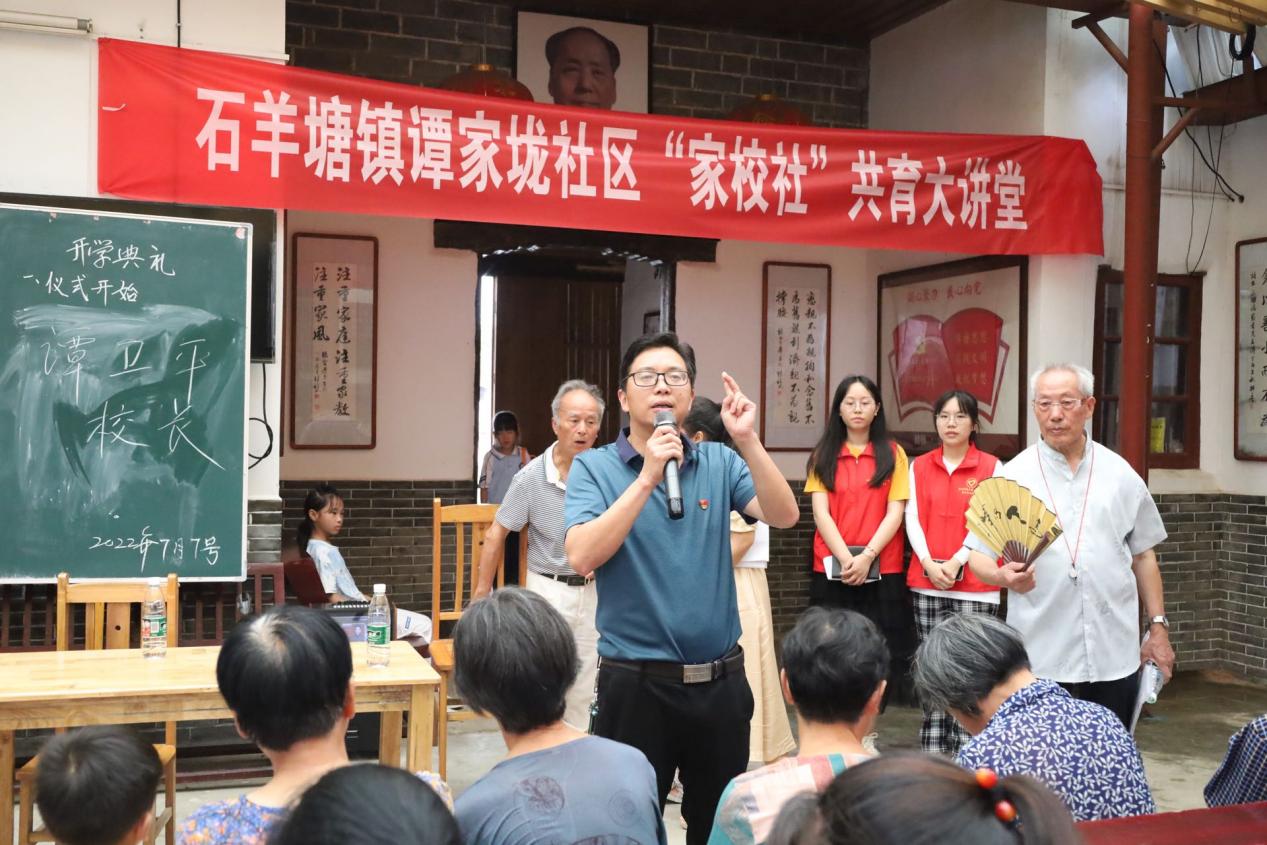 家校社共育,访帮扶一体。攸县家校社共育宣讲师、鸭塘铺中学校长谭卫平出席典礼并发表讲话,他对当下家庭、学校与社会之间的儿童教育问题进行详细解读,多次强调要关注儿童的身心健康,并指出“家校社”共同培育的重要性与必要性。