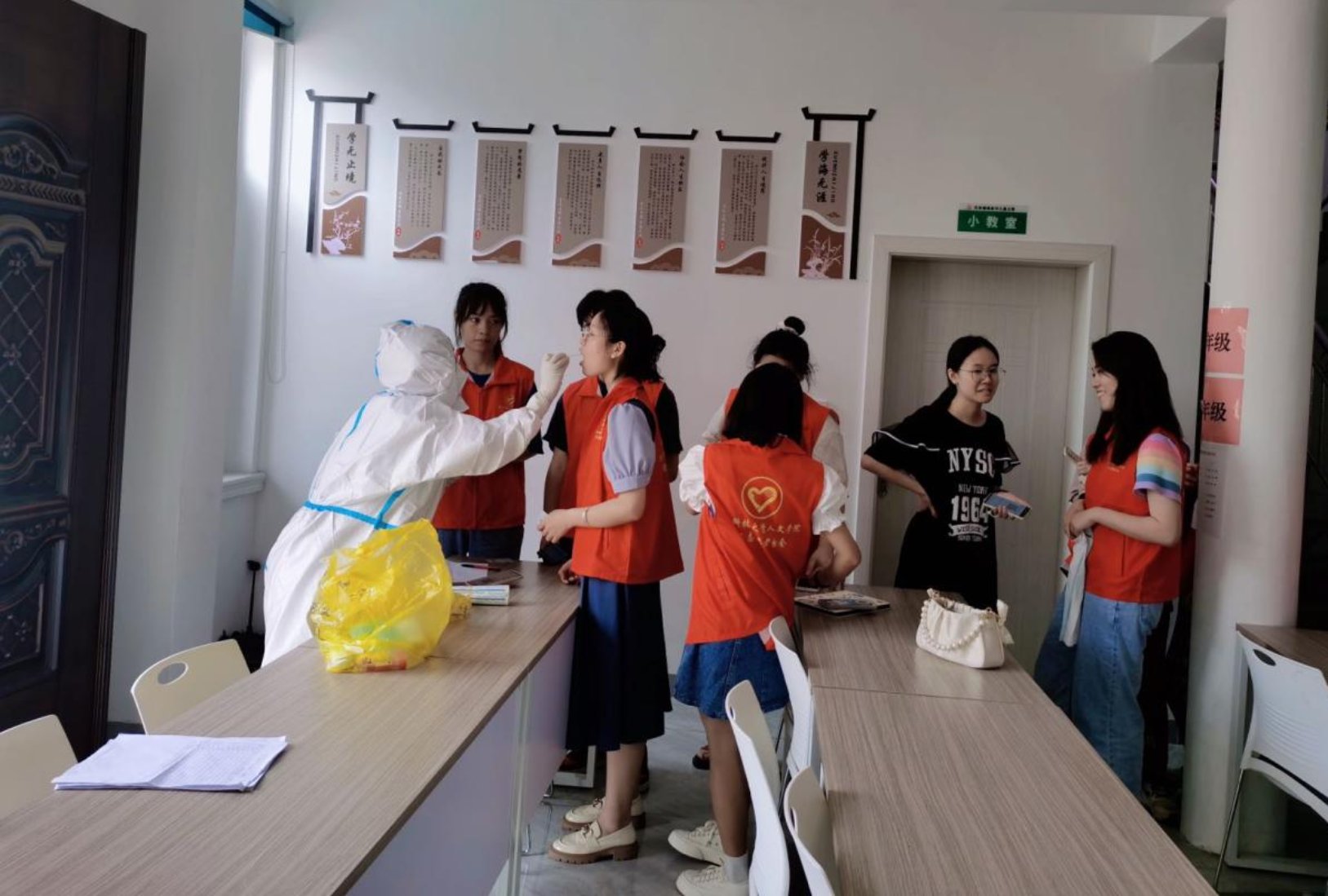 为加强疫情防控,保证儿童之家暑期支教活动的有序与平稳展开,志愿者们积极配合当地防疫要求,提前完成核酸检测任务。此外,暑期志愿者每天第一节课为同学们测量体温,保证防疫教学两不误。