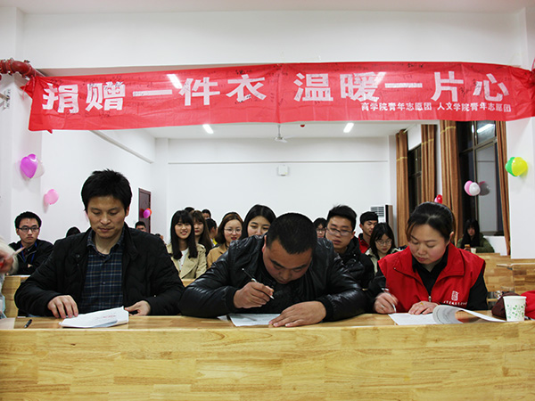 24日晚,我院青年志愿团与商学院青年志愿团联合湘潭市莲城志愿者协会开展的衣物捐赠志愿活动启动仪式,在文科楼B418教室暖心举行。莲城志愿者协会会长杨波、协会秘书长郭喜、我院青年志愿团成员,商学院青年志愿团成员及我院学生会干部参加启动仪式。