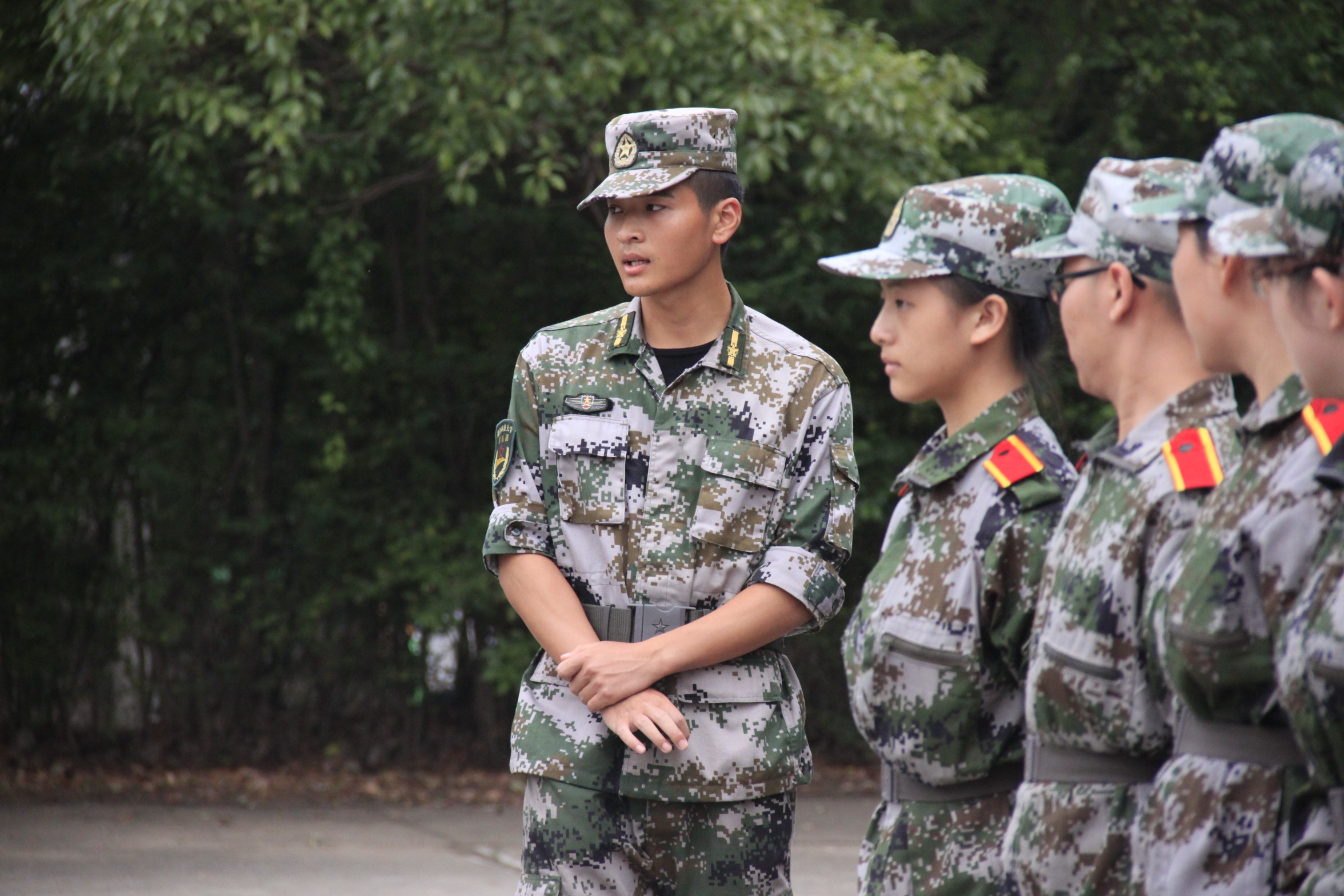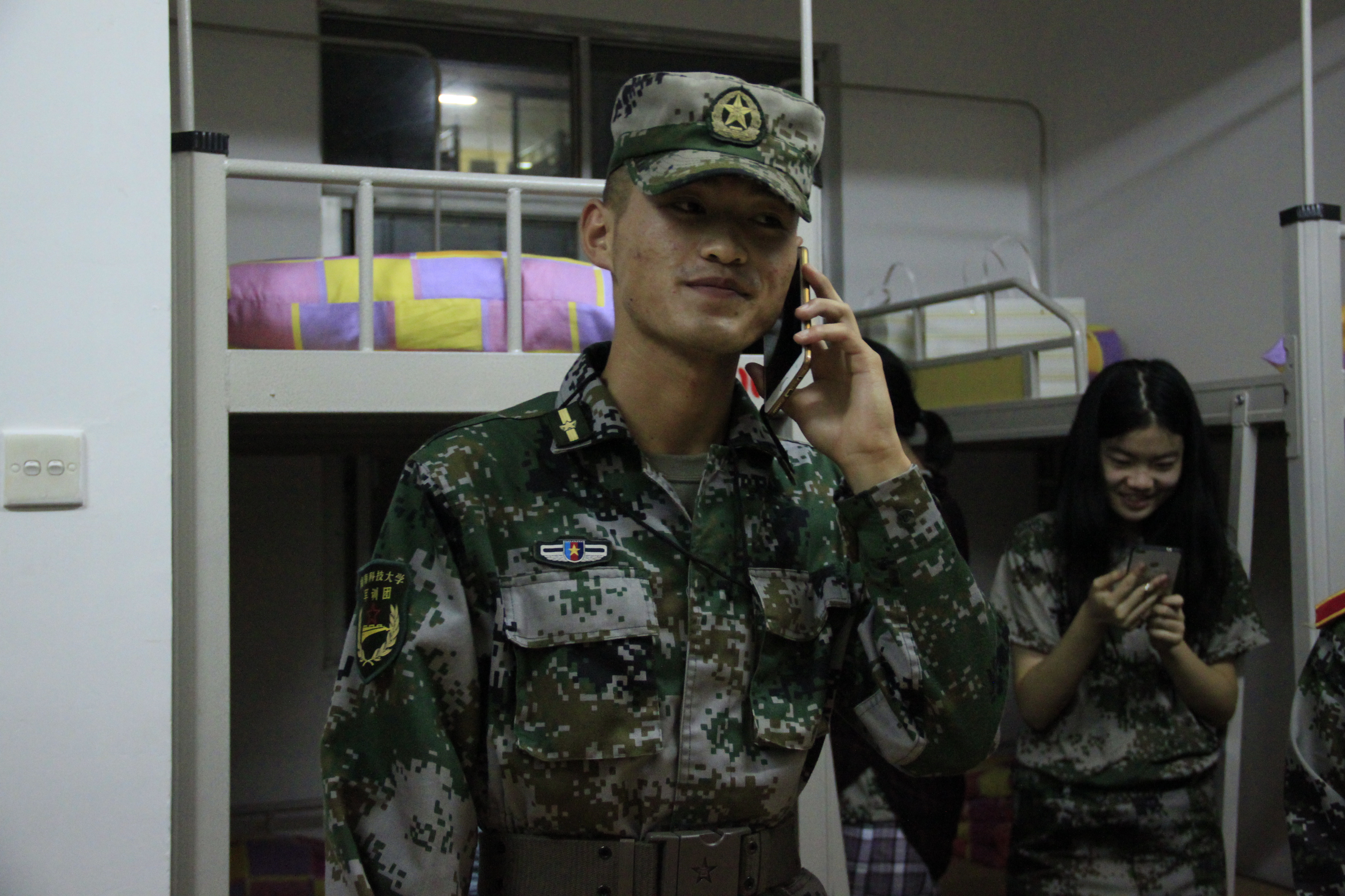 谈到自己印象深刻的事,王教如数家珍。中秋夜下寝时,排里有两个女生过生日,王教就被邀请和他们一起过生日,分蛋糕。每天带训把嗓子喊哑了,排里的女生就准备了保护嗓子的东西给他。“他们真的很贴心,挺感动的。”休息时,王教会让新生们展示才艺,他们有人会唱歌、跳舞,他会仔细看每一篇军训感言,“有的学生还会写诗,挺意外的,他们真的都很多才多艺。”王教认真地夸赞自己排里的新生们。经过一周的训练,王教把大家的进步都看在眼里。“一开始,有些女生们容易有小动作,现在他们都很老实了。体能训练,站军姿也比前好很多。下寝的时候,他们的被子也叠得不错。”