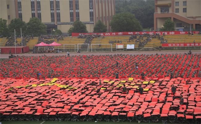 各个学院的“小绿人”们集合完毕后,穿绿色迷彩的全体新生们或顶或举着半米见方的一面红一或一面黄的纸板;主席台上,指挥教官手持话筒指挥新生们用纸板摆出各种字样及图形。全校新生共分为A,B,C三个区,每个学生都有各自的顺序,在教官的精心指挥下,A区新生相继摆出国旗,党旗与科大校旗。“B区C区做准备!”在各区按不同学院名称指示进行变换符号环节,指挥官一声令下,B区与C区的同学准确及时地抬起纸板,顷刻之间,红色的大背景上陆续出现“信息”、“物电”等各学院的简称。