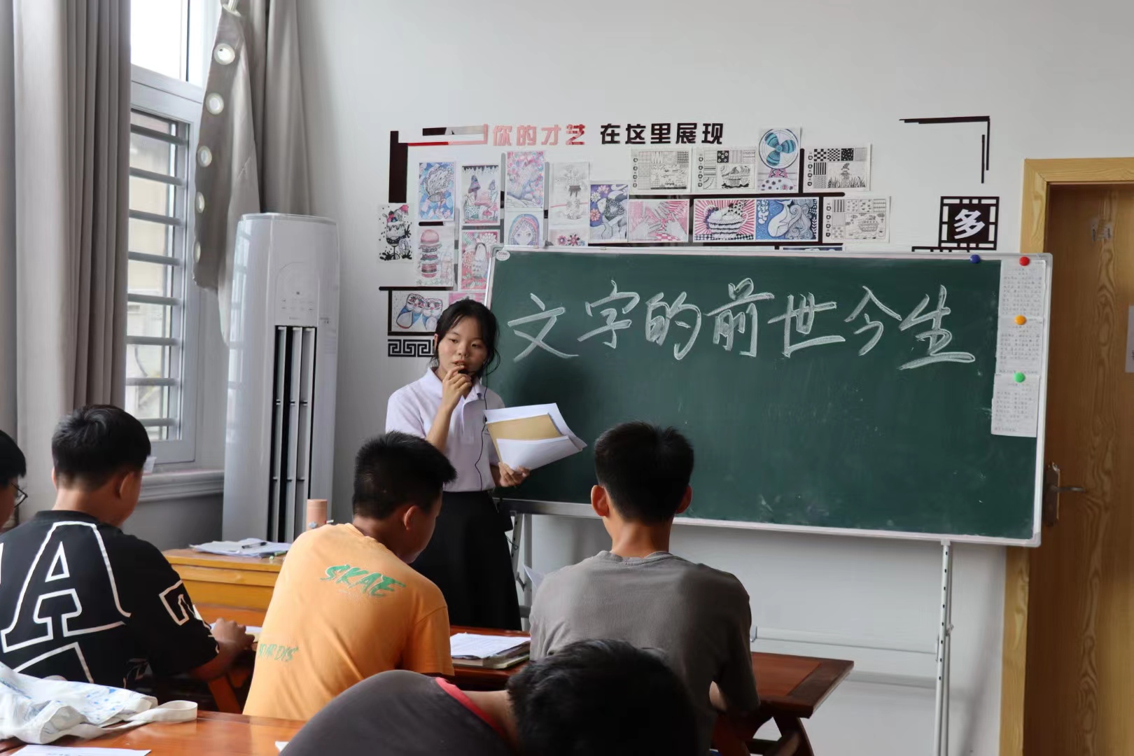 华夏文字见传承,历史普及助振兴。“求木之长者,必固其根本;欲流之远者,必浚其泉源”,铭记历史,不容忽视。为让学生从历史演变中认识汉字的魅力,志愿者陈意和陈佳祺开展关于文字的普及课堂。陈佳祺从齐白石题字喻课的小故事引入课堂,让孩子们思考汉字结构的秘密。而志愿者陈意则从文字的前世今生讲起中华文明的起源,从夏商西周到大秦帝国,从占卜陶文到大篆小篆 ,让学生们在历史的海洋中畅游,助推中华民族伟大复兴。