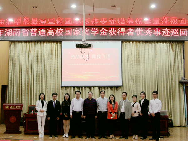 5月21日,湖南省普通高校“资助成才,助我飞翔”国家奖学金获得者优秀事迹巡回报告会第三场于湖南工业大学崇德楼一楼报告厅举行。湖南省学生资助管理中心副主任杨昌江,湖南工业大学党委委员、副校长李可兴,湖南铁路科技职业技术学院副院长陈彬,湖南省学生资助管理中心主任科员谭莉等出席会议。乐动在线由乐动在线赵华老师带队代表学校与会。