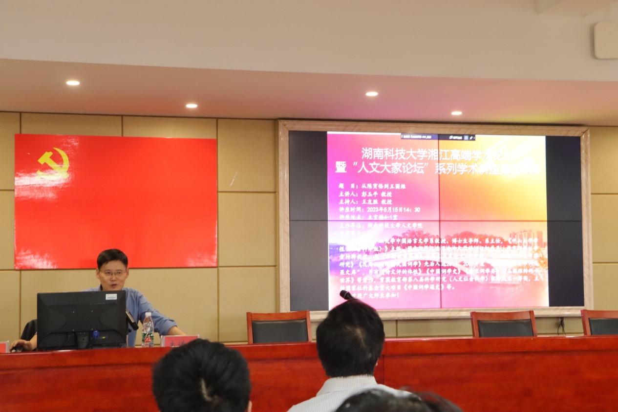 5月15日下午,我院于立言楼B4-1室举办湘江高端学术论坛暨“人文大家论坛”系列学术讲座246讲。中山大学中国语言文学系教授彭玉平应邀来我院作主题为“从陈寅恪到王国维”的学术讲座,我院教师及21级本科生代表到场参与,本次讲座由王友胜教授主持。