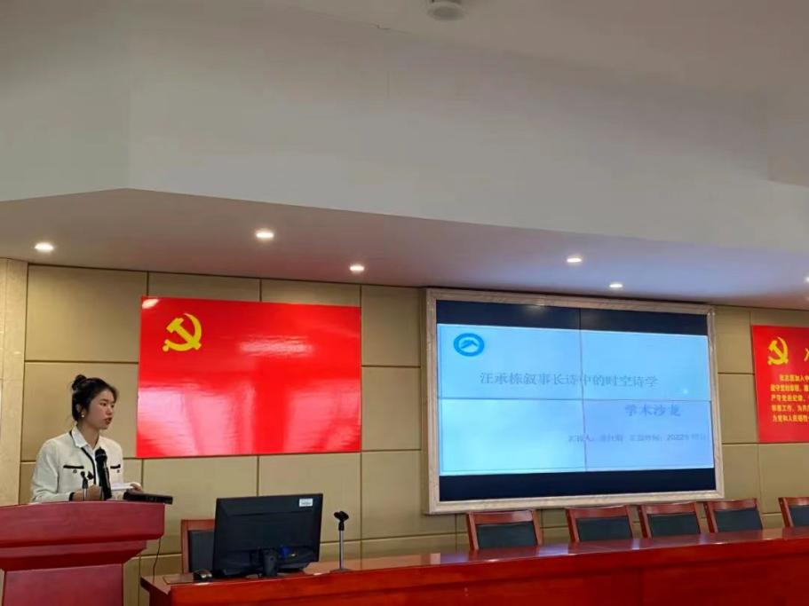 熊杜娟同学分享的题目是《汪承栋叙事长诗中的时空诗学》,从时间的延宕和空间的拓展、时空意象的多维呈现形态、长诗作品中时空结构的塑构三个层面进行了剖析。