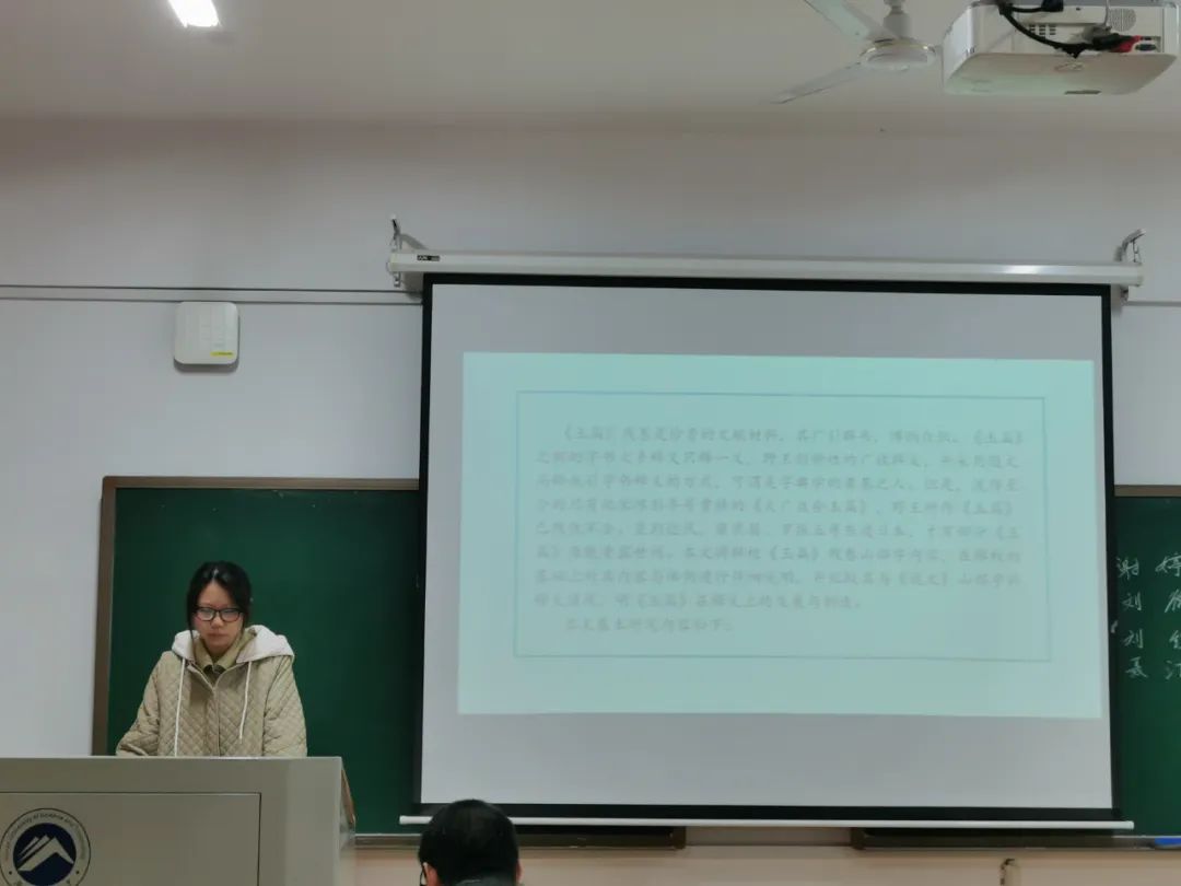 刘微汇报了题为《<英藏敦煌社会历史文献释录>1-19卷用字研究》的毕业论文。徐前师老师建议将标题重新编排得更加简洁,关于敦煌文献的研究价值,赖积船老师认为其校勘价值高于文字价值,行文上应体现批判讹误字的价值取向,不能引导人使用异体字、通假字。尹戴忠老师建议论文要体现“释录研究”的研究主体,并指出某些章节名和论文题目重合度高的问题。秦老师在关键词的编排问题上进行补充,提醒同学们注意论文写作中的研究重点。